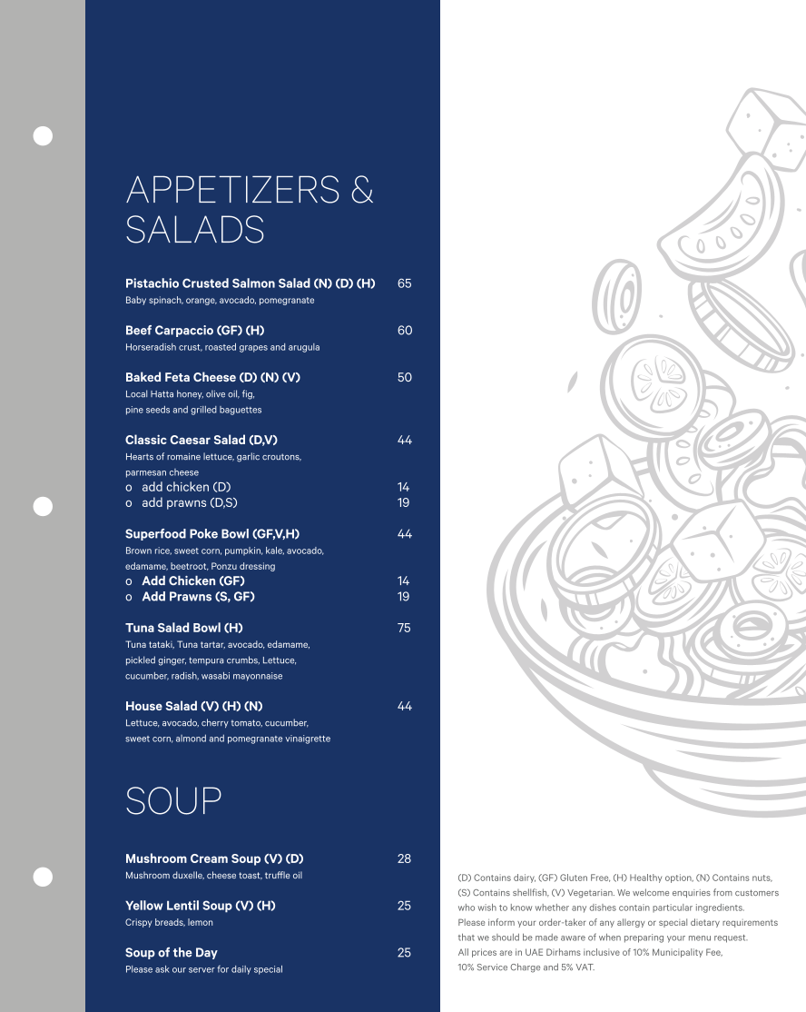 At Al Qubtan Restaurant, located at the Sheraton Sharjah Beach Resort & Spa, the menu offers a delightful and diverse selection of dishes that cater to a variety of tastes. For those starting their meal with something light and refreshing, the Pistachio Crusted Salmon Salad (N) (D) (H) and Beef Carpaccio (GF) (H) provide a perfect introduction. Vegetarians can enjoy the Classic Caesar Salad (D, V) or the vibrant Superfood Poke Bowl (GF, V, H). If you're in the mood for something comforting, the Mushroom Cream Soup (V) (D) or the hearty Yellow Lentil Soup (V) (H) are excellent choices.