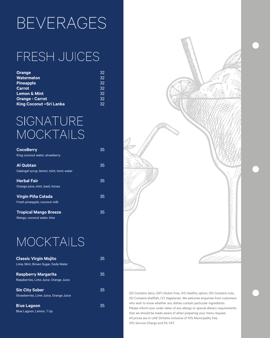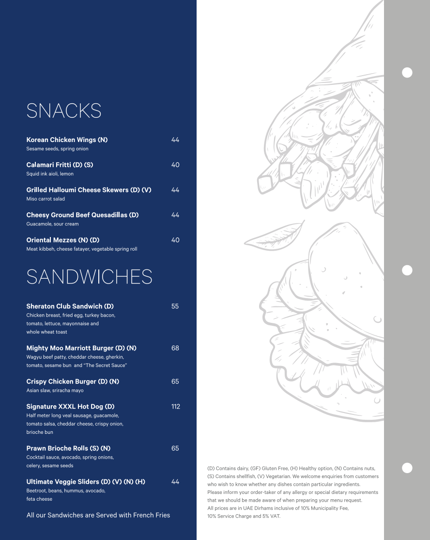 When it comes to snacks, Al Qubtan doesn’t disappoint, offering flavorsome options like Korean Chicken Wings (N), Calamari Fritti (D) (S), and Grilled Halloumi Cheese Skewers (D) (V). For those craving something more substantial, the Sheraton Club Sandwich (D) and the indulgent Mighty Moo Marriott Burger (D) (N) are great picks. The Signature XXXL Hot Dog (D) stands out for those looking for something different.