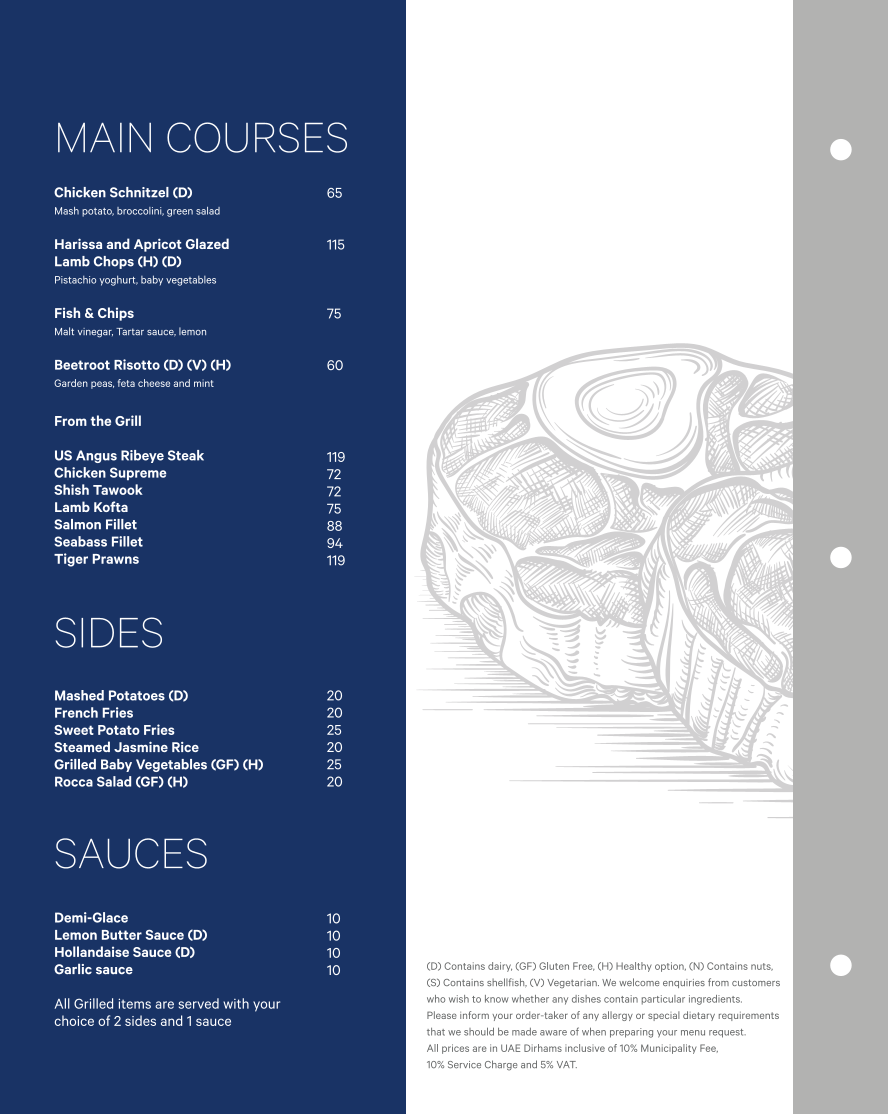 Main courses at Al Qubtan include hearty and delicious options such as the crispy Chicken Schnitzel (D), the tender Harissa and Apricot Glazed Lamb Chops (H) (D), and the classic Fish & Chips. Vegetarians can enjoy the rich flavors of Beetroot Risotto (D) (V) (H), while meat lovers can indulge in the savory US Angus Ribeye Steak.